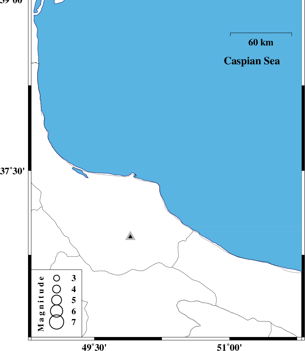 | 2013/05/15 | 08:57:48.2 | 13:27:48.2 | 37.51 | 50.3 | 14 | ML2.7 | Caspian Sea, 41 km North of Rudsar |