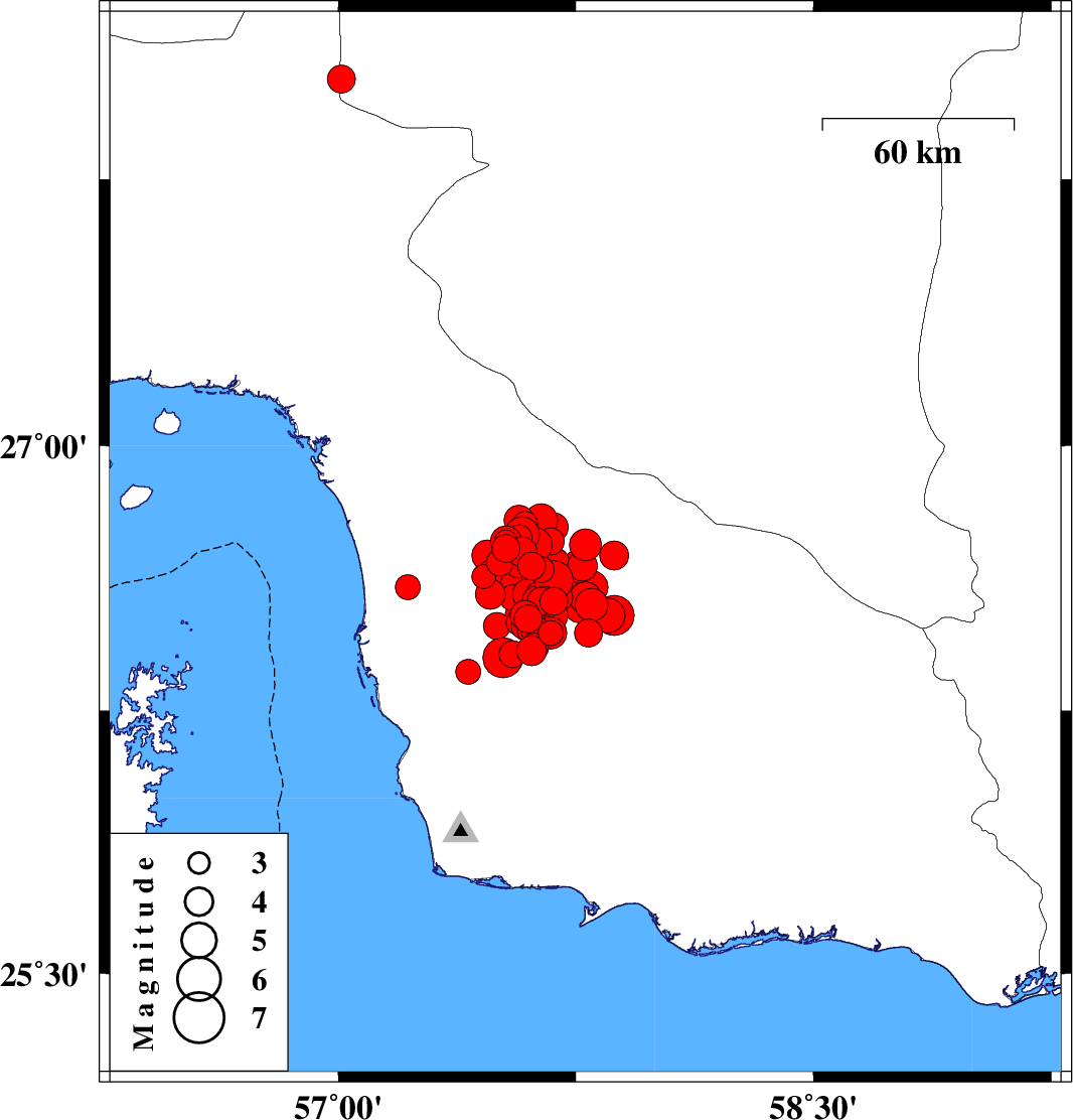 2013/05/14 10:02:36.7 14:32:36.7 26.5157.614 ML4 Hormozgan Province, 100 km South-East of Manujan