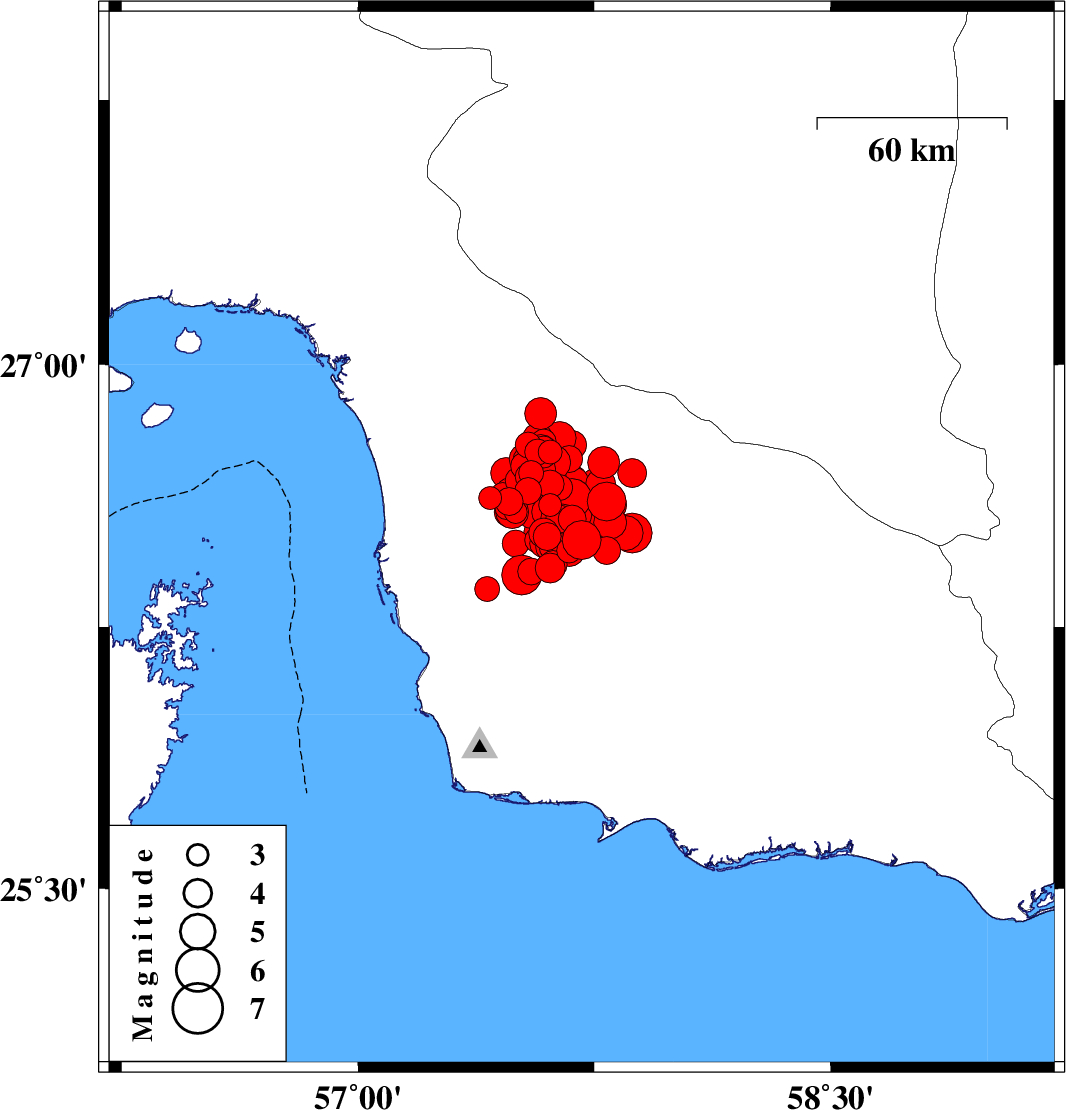 2013/05/14 10:02:36.7 14:32:36.7 26.5157.614 ML4 Hormozgan Province, 100 km South-East of Manujan