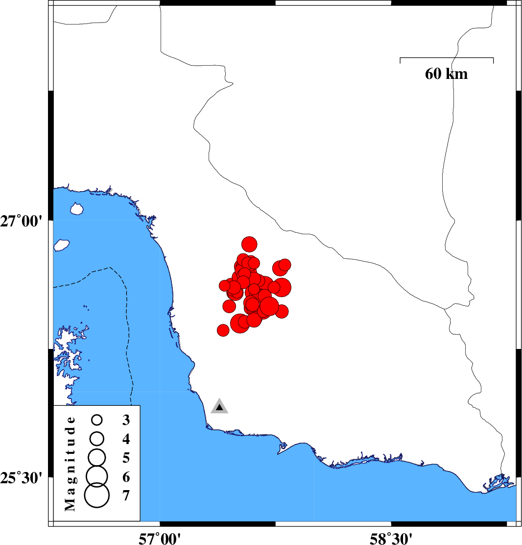 2013/05/14 10:02:36.7 14:32:36.7 26.5157.614 ML4 Hormozgan Province, 100 km South-East of Manujan