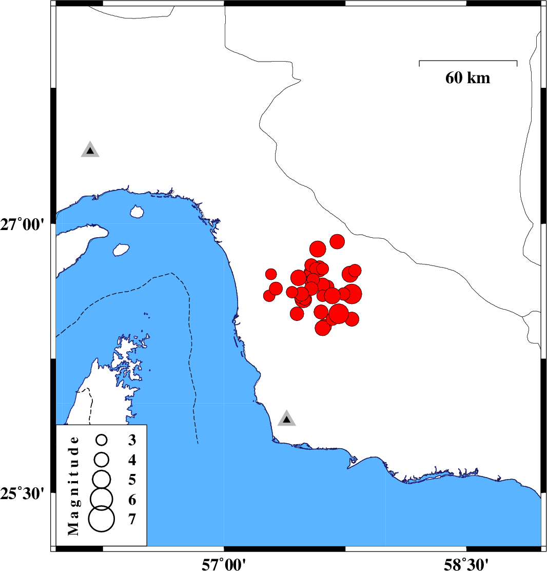 2013/05/14 10:02:36.7 14:32:36.7 26.5157.614 ML4 Hormozgan Province, 100 km South-East of Manujan