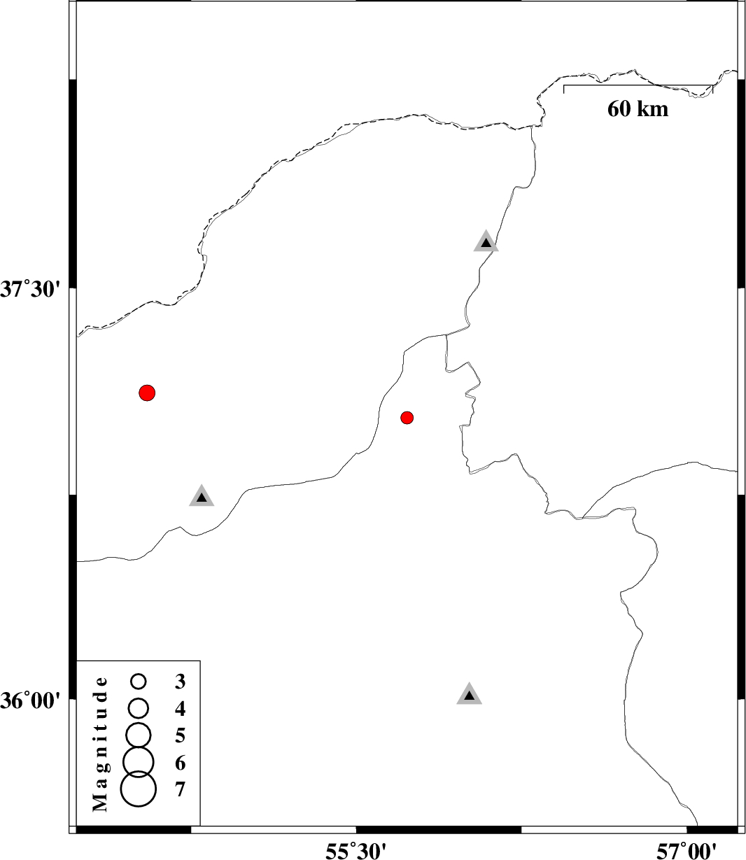 | 2013/05/21 | 05:30:25.4 | 10:00:25.4 | 37.12 | 54.55 | 18 | ML3.3 | Golestan Province, 14 km North of Aq Qaleh |