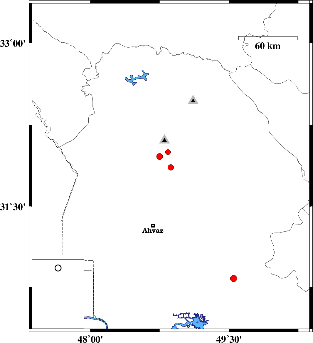 | 2013/05/28 | 15:39:00.3 | 20:09:00.3 | 32 | 48.84 | 15 | ML2.6 | Khoozestan Province, 5 km Shushtar | ||