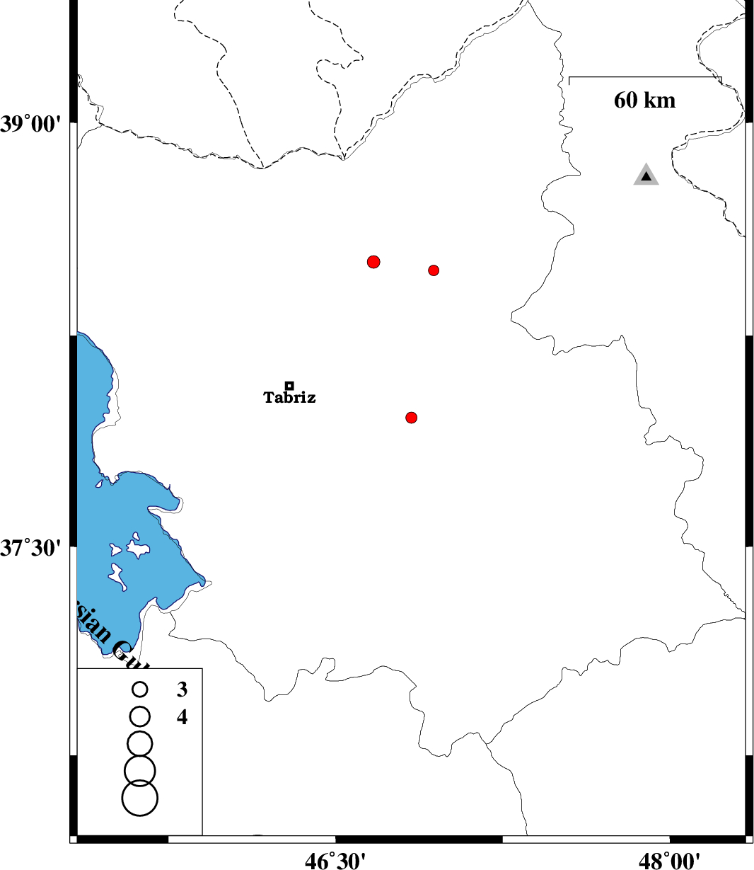 | 2013/05/29 | 08:15:27.9 | 12:45:27.9 | 37.96 | 46.84 | 14 | ML2.3 | Azarbaijan Sharghi Province, 13 km North of Bostanabad | ||