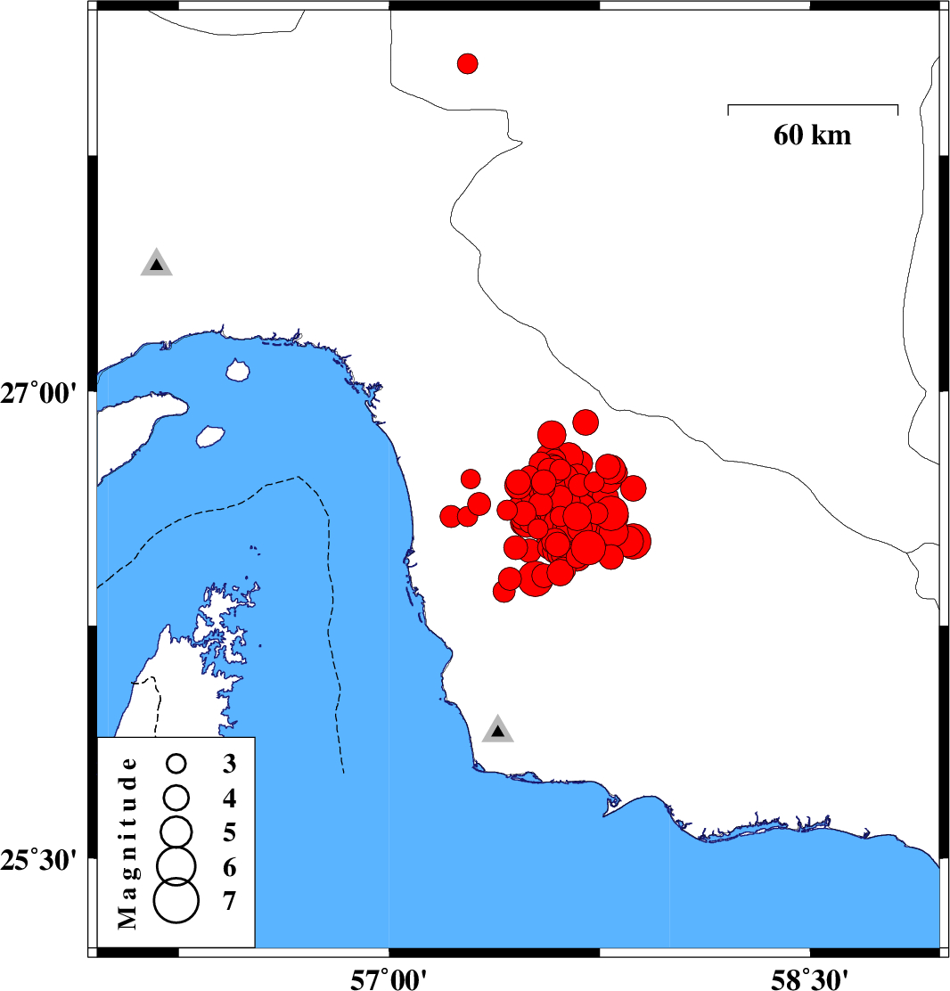 2013/05/14 10:02:36.7 14:32:36.7 26.5157.614 ML4 Hormozgan Province, 100 km South-East of Manujan