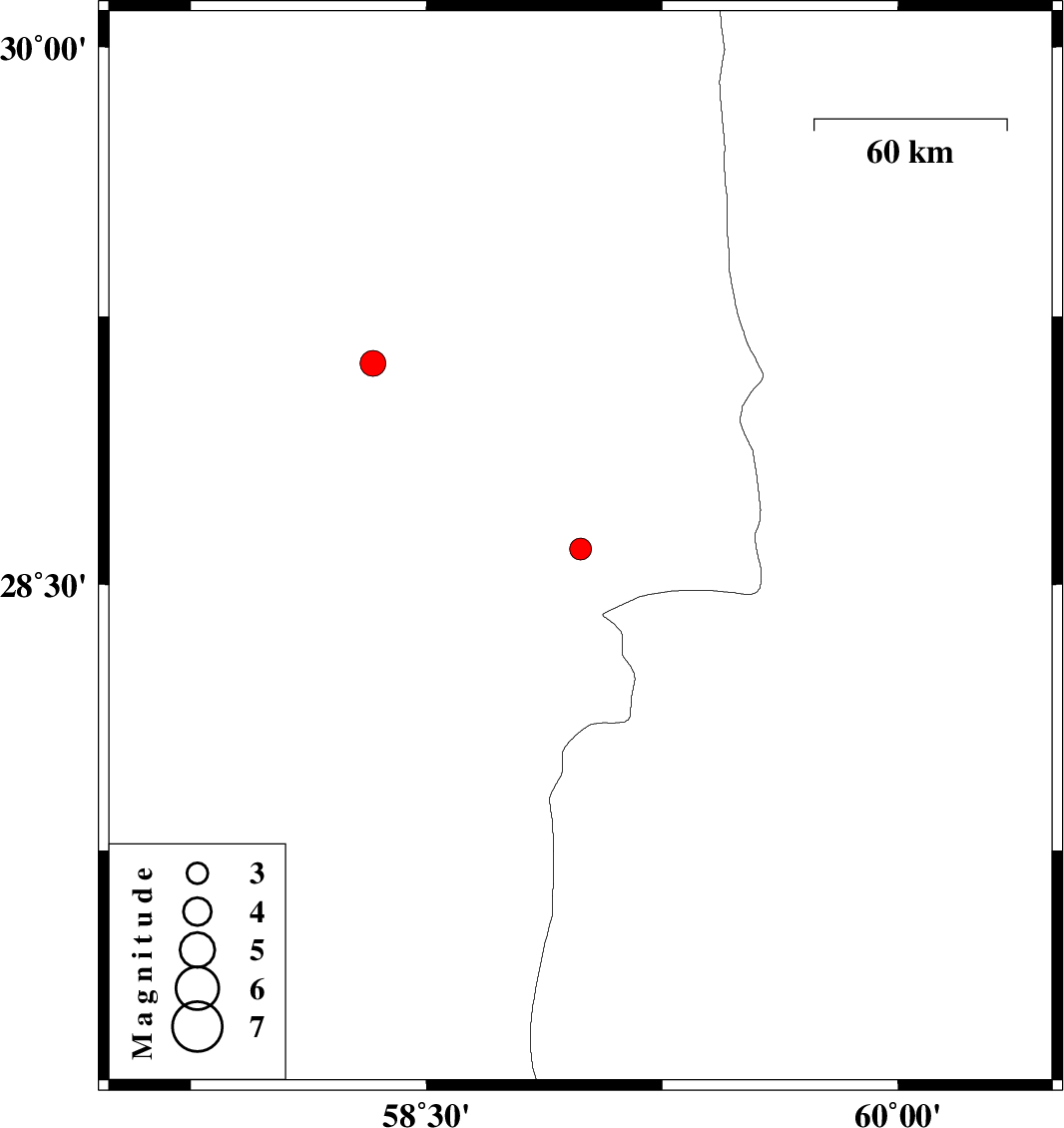| 2013/06/18 | 21:00:56.3 | 01:30:56.3 | 28.6 | 58.99 | 14 | ML3.1 | Kerman Province, 83 km South-East of Bam | ||