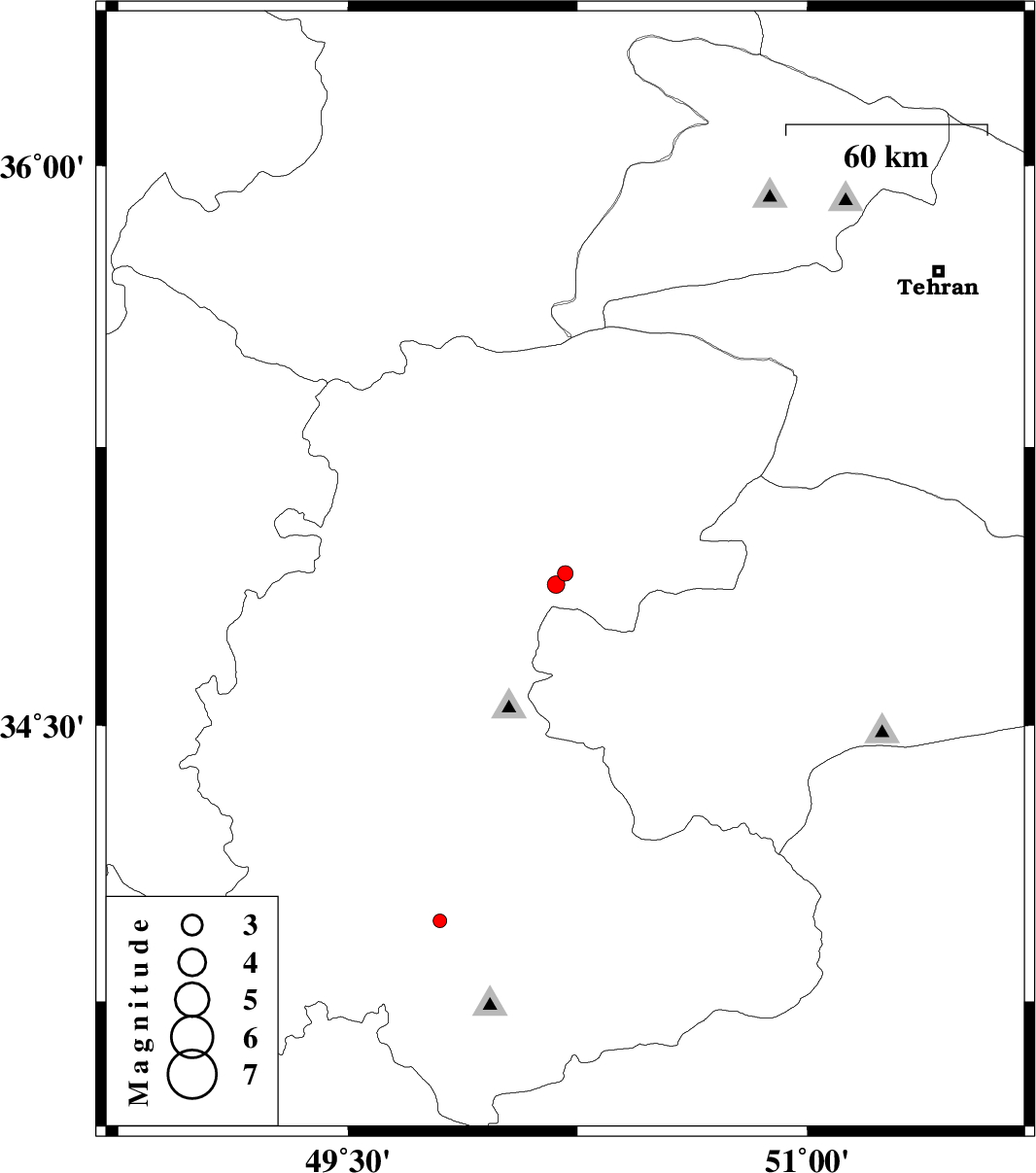 | 2013/06/23 | 09:30:14.1 | 14:00:14.1 | 33.97 | 49.8 | 24 | ML2 | Markazi Province, 17 km South-East of Arak | ||