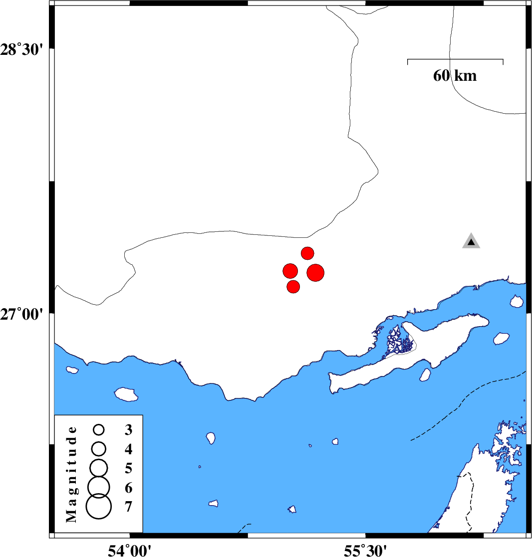 | 2013/07/02 | 16:04:42.4 | 20:34:42.4 | 27.15 | 55.04 | 14 | ML3.6 | Hormozgan Province, 67 km East of Bastak | ||