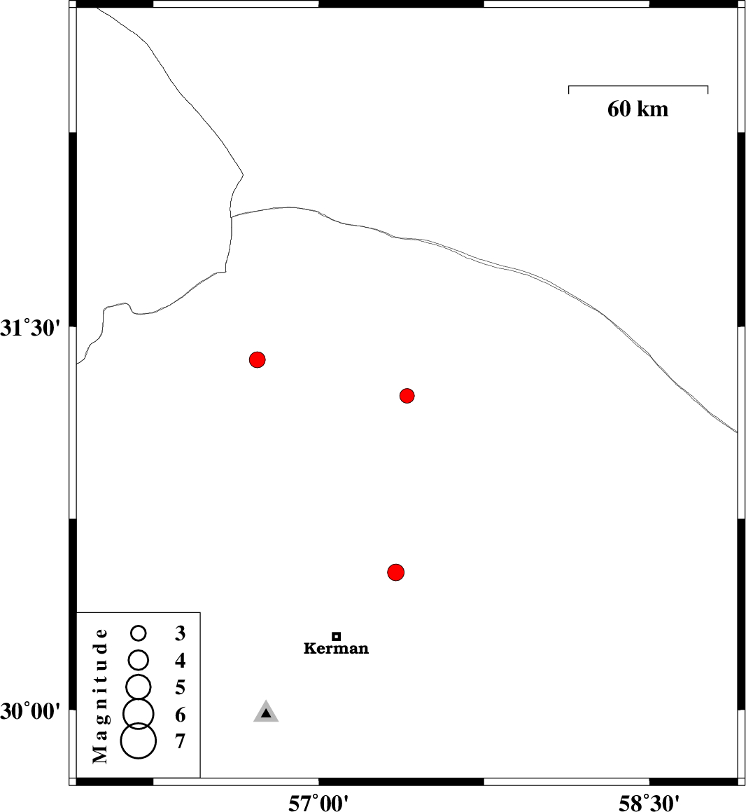 | 2013/06/26 | 19:05:04.3 | 23:35:04.3 | 31.37 | 56.72 | 14 | ML3.2 | Kerman Province, 14 km Ravar |
