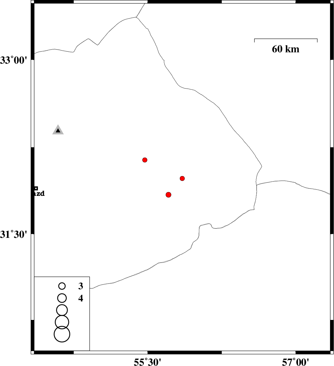 | 2013/07/26 | 11:40:32.1 | 16:10:32.1 | 32.14 | 55.47 | 14 | ML2.1 | Yazd Province, 60 km North of Bafq | ||