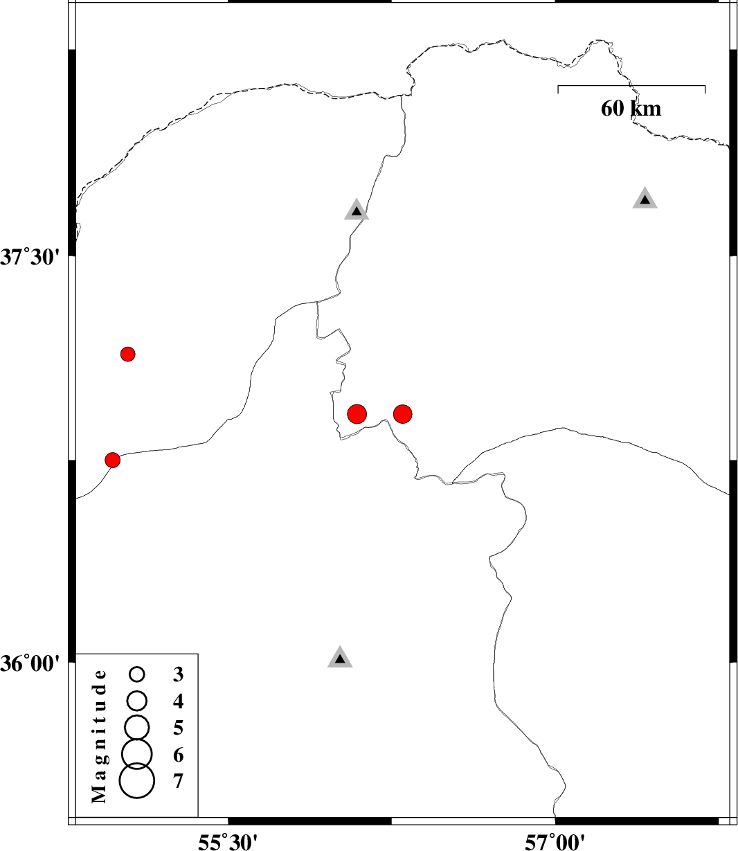 | 2013/07/15 | 00:23:25.8 | 04:53:25.8 | 36.75 | 54.97 | 18 | ML3.1 | Golestan Province, 19 km South-East of Ali Abad |