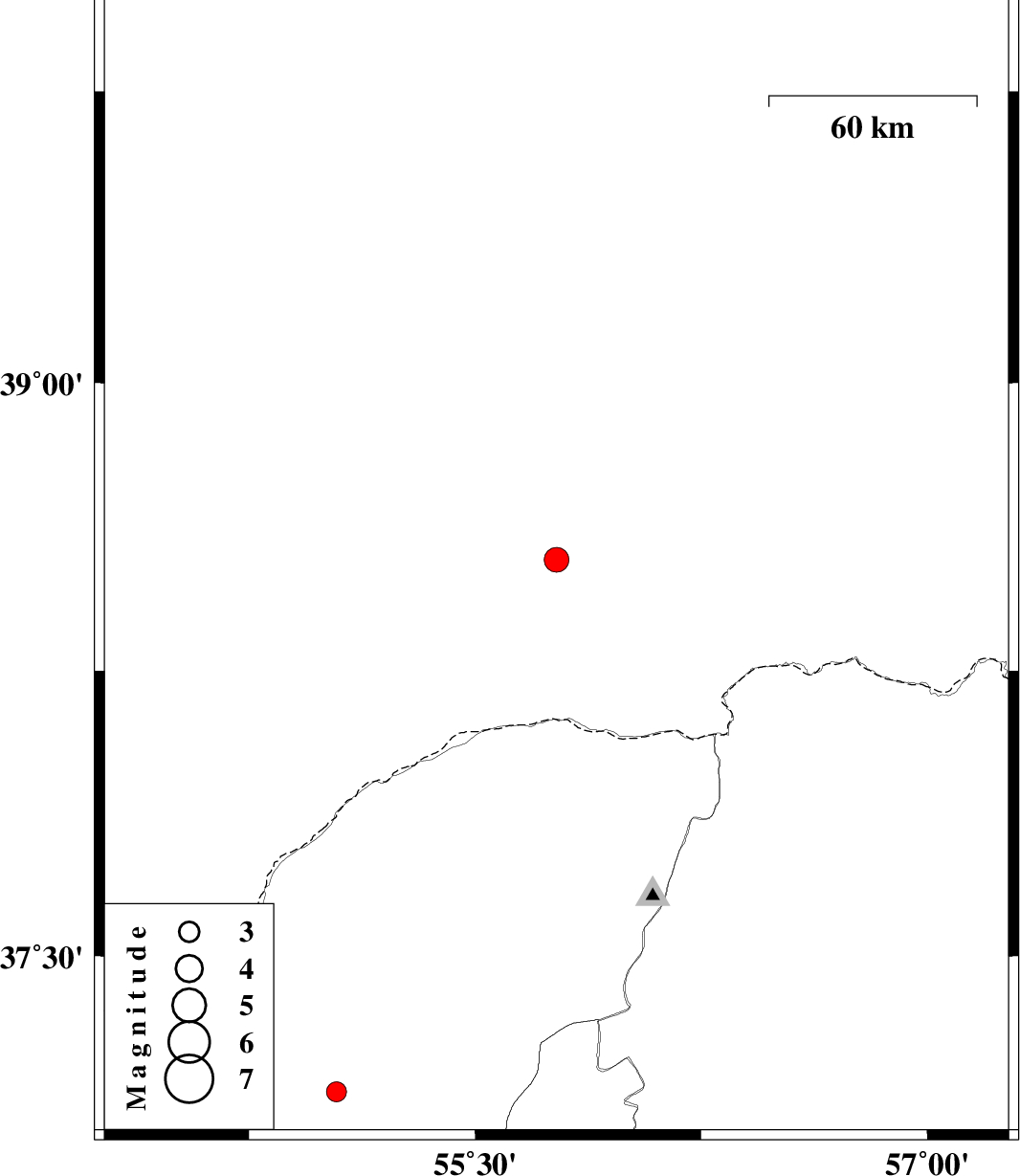 | 2013/08/03 | 13:52:21.1 | 18:22:21.1 | 37.14 | 55.04 | 16 | ML2.9 | Golestan Province, 14 km West of Azadshahr |