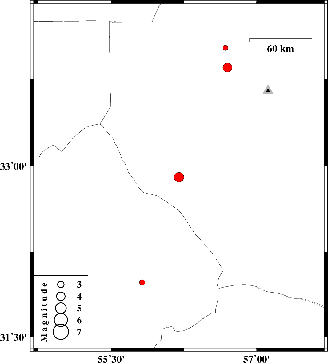 | 2013/08/15 | 20:08:41.7 | 00:38:41.7 | 32.9 | 56.2 | 14 | ML4.5 | Yazd Province, 103 km South-West of Tabas | ||
