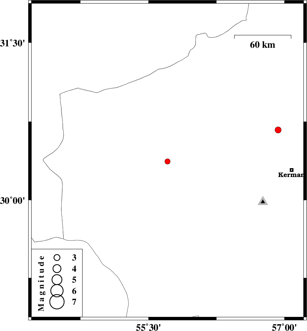 | 2013/08/27 | 00:54:56.3 | 05:24:56.3 | 30.67 | 56.93 | 15 | ML3.1 | Kerman Province, 38 km South-East of Zarand |
