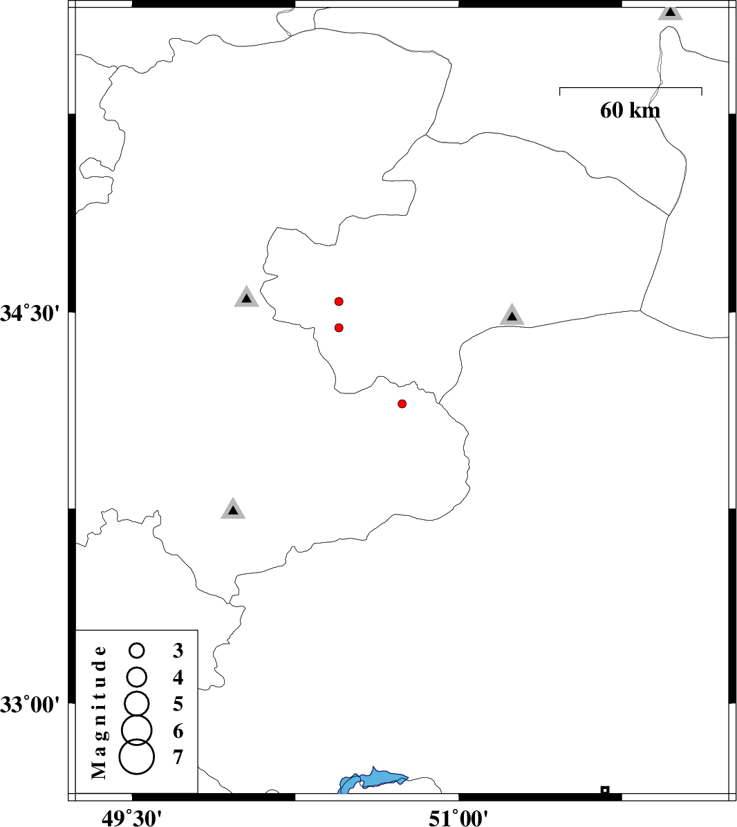 | 2013/09/03 | 15:15:45.2 | 19:45:45.2 | 34.54 | 50.45 | 14 | ML1.7 | Qom Province, 41 km East of Ashtiyan |