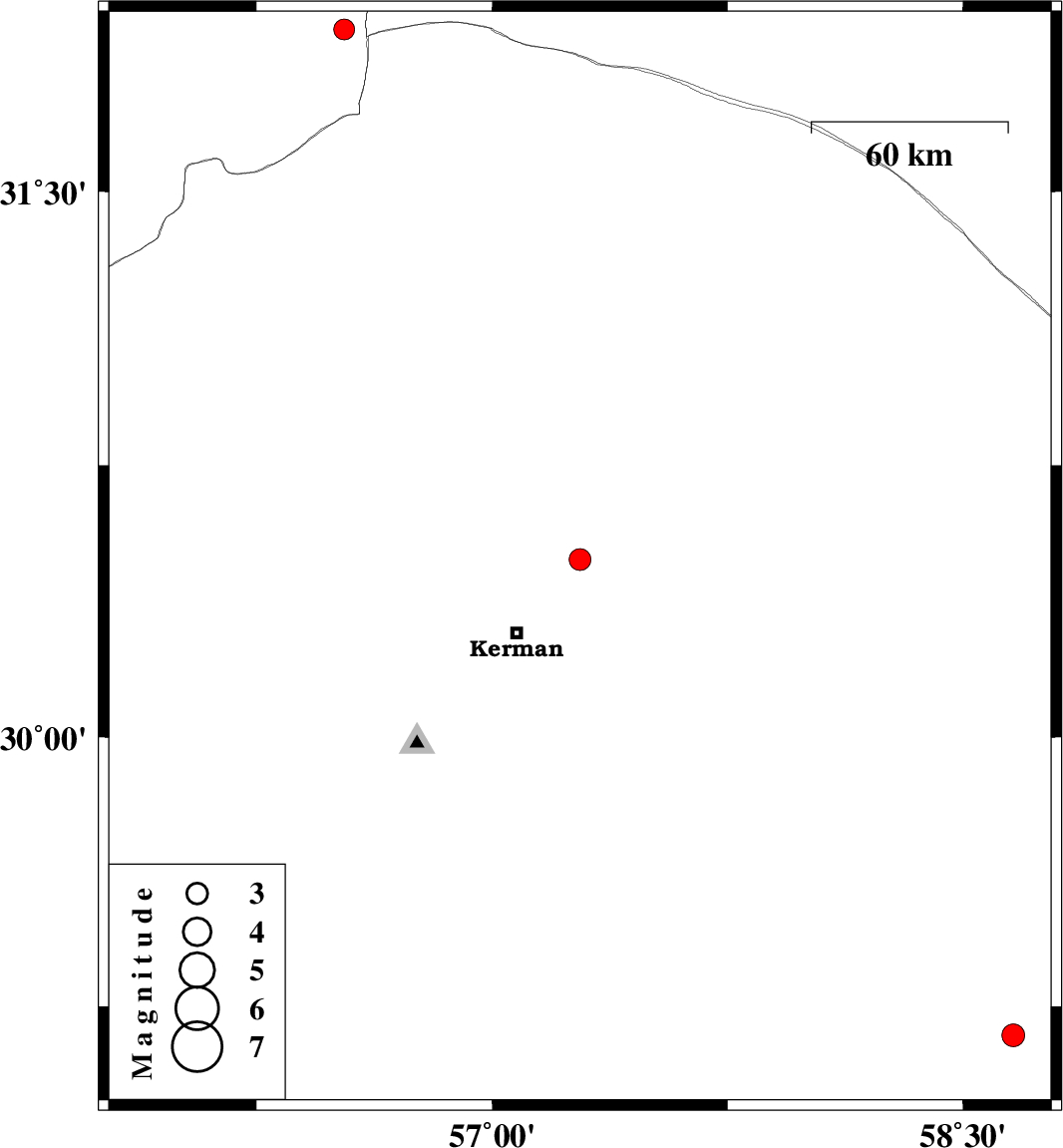 | 2013/09/07 | 23:20:08.2 | 03:50:08.2 | 30.49 | 57.28 | 14 | ML3.1 | Kerman Province, 29 km North-East of Kerman | ||
