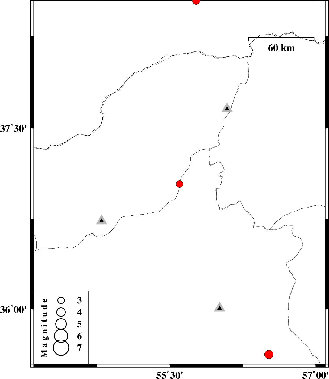 | 2013/09/08 | 20:39:03.2 | 01:09:03.2 | 37.04 | 55.6 | 18 | ML3.2 | Semnan Province, 29 km South-East of Minodasht | ||