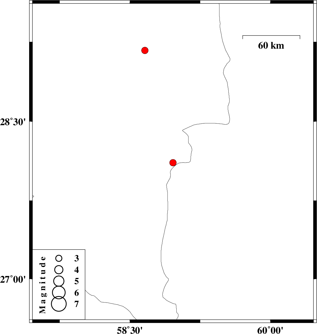 | 2013/09/22 | 23:13:36.4 | 02:43:36.4 | 28.11 | 58.96 | 18 | ML3.3 | Kerman Province, 125 km North-East of Kahnuj | ||