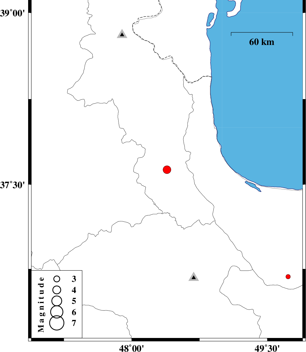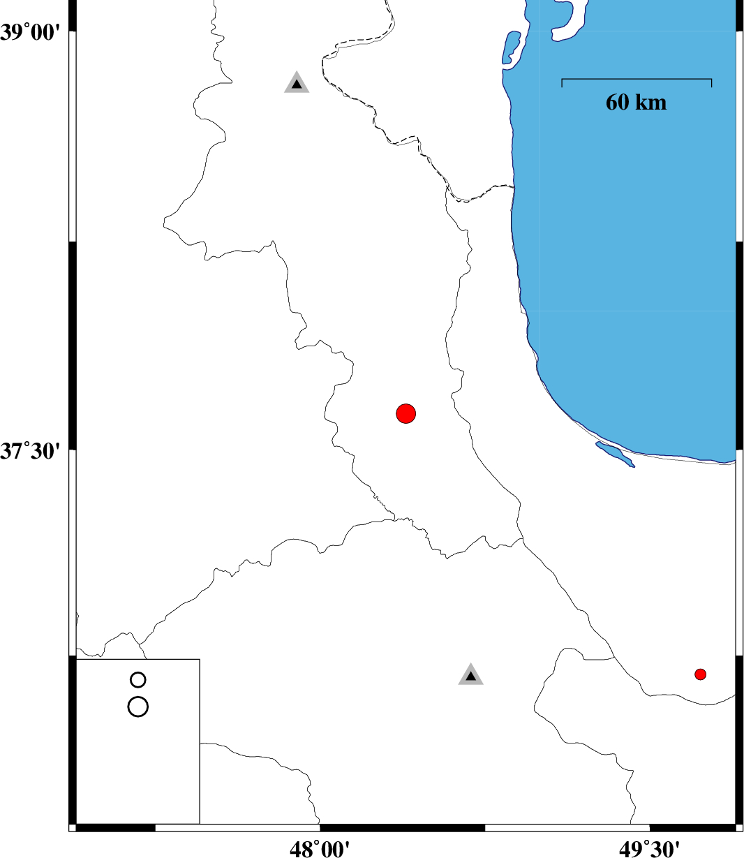 | 2013/10/13 | 22:21:54.7 | 01:51:54.7 | 37.63 | 48.39 | 14 | ML3.9 | Ardebil Province, 7 km Givi | ||