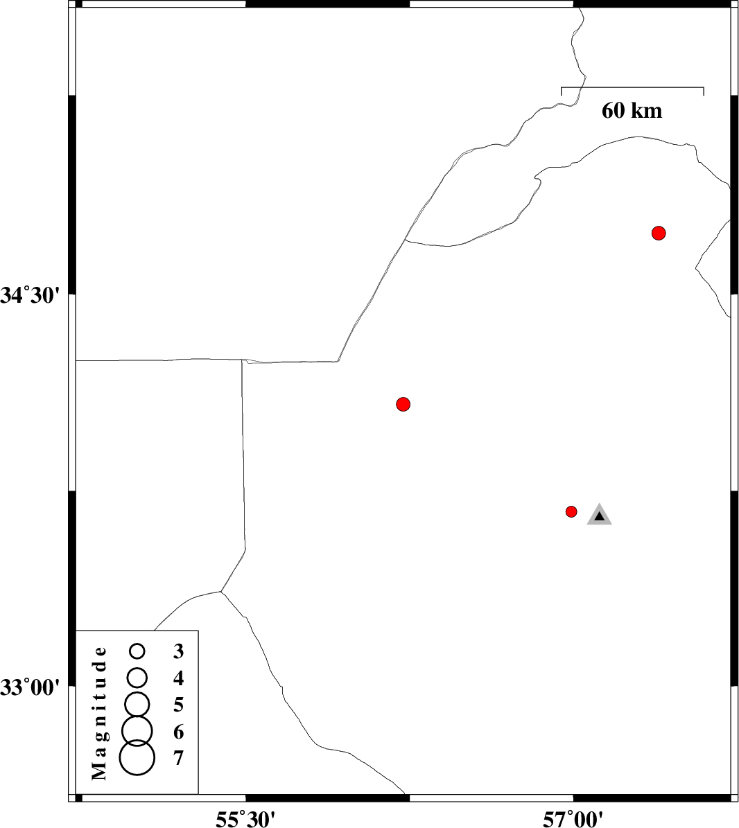 | 2013/10/20 | 18:30:23.8 | 22:00:23.8 | 34.08 | 56.22 | 32 | ML2.8 | Yazd Province, 84 km North-West of Tabas | ||