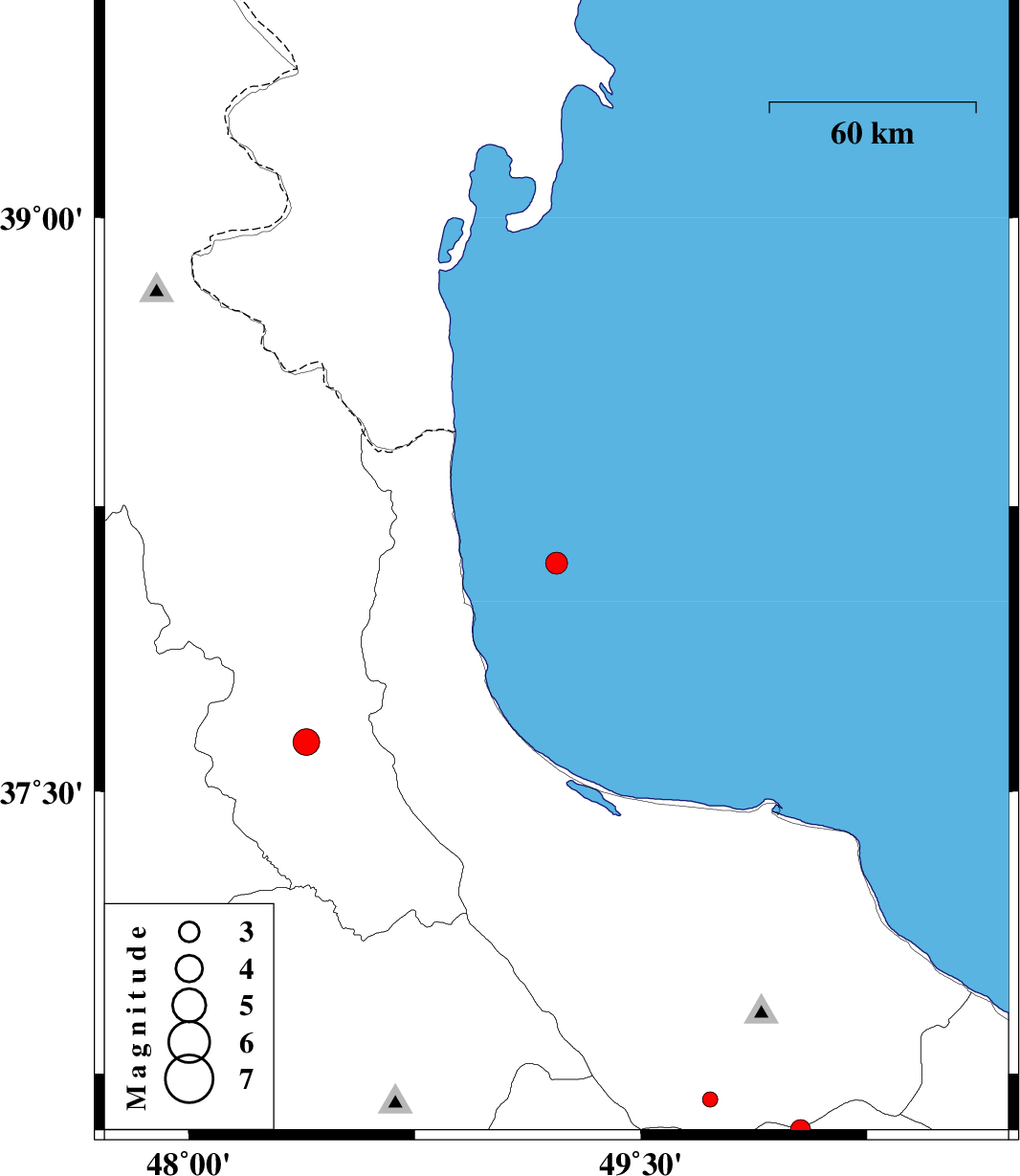 | 2013/10/21 | 23:28:38.2 | 02:58:38.2 | 38.1 | 49.22 | 15 | ML3.3 | Caspian Sea, 44 km North-East of Hashtpar | ||