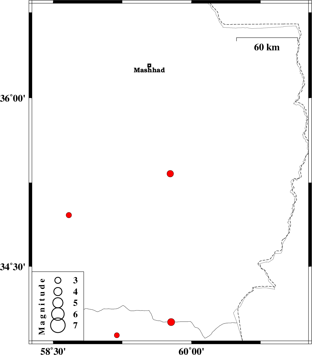 | 2013/10/16 | 01:05:19.2 | 04:35:19.2 | 34.96 | 58.67 | 14 | ML2.7 | Khorasan(center) Province, 36 km South-East of Kashmar |