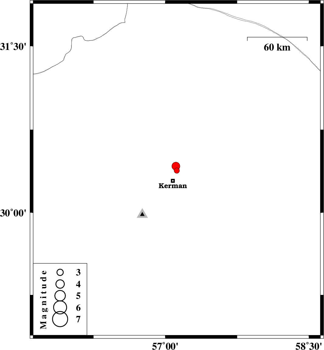 | 2013/11/12 | 02:27:23.4 | 05:57:23.4 | 30.42 | 57.11 | 14 | ML3.8 | Kerman Province, 15 km North of Kerman |