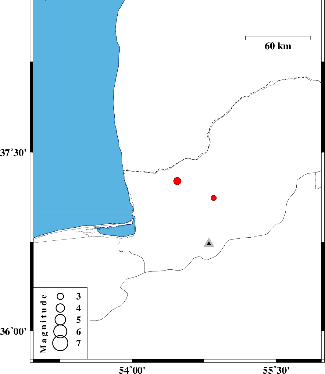 | 2013/11/06 | 21:44:47.2 | 01:14:47.2 | 37.12 | 54.85 | 17 | ML2.5 | Golestan Province, 23 km North of Ali Abad |