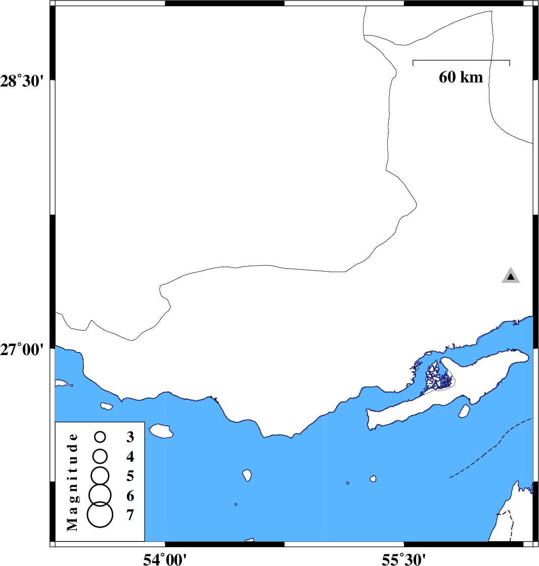 | 2013/11/17 | 14:55:42.6 | 18:25:42.6 | 27.41 | 54.81 | 18 | ML3.6 | Hormozgan Province, 50 km North-East of Bastak |
