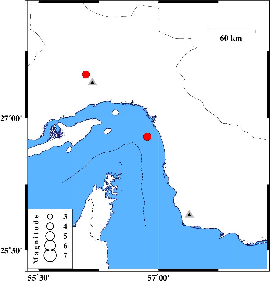 | 2013/11/27 | 07:25:40.5 | 10:55:40.5 | 26.79 | 56.86 | 8 | ML4.5 | Oman Sea, 46 km South-West of Minab | ||