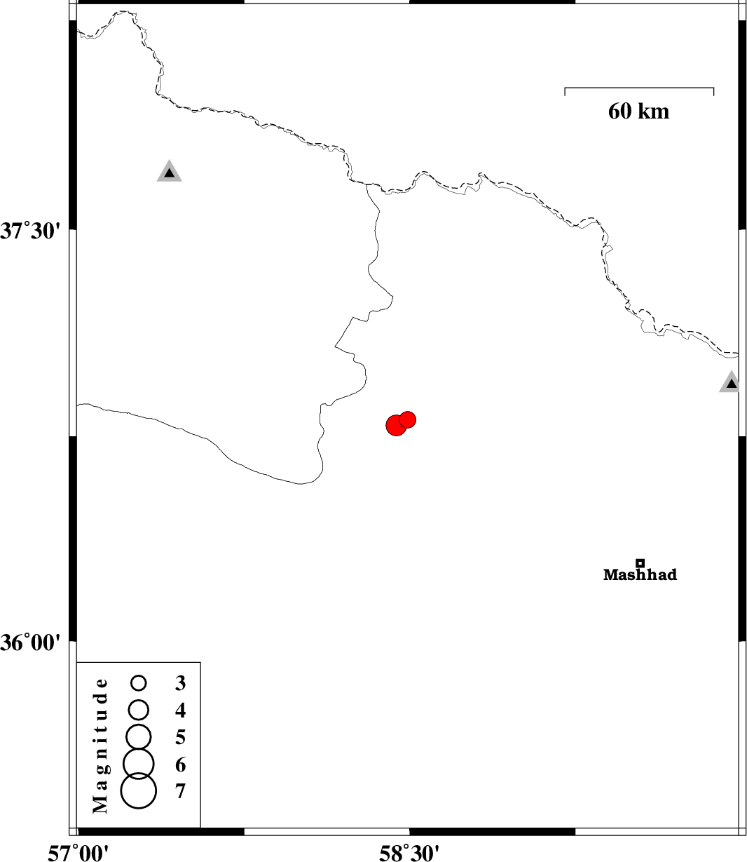 | 2013/12/07 | 23:12:42.5 | 02:42:42.5 | 36.79 | 58.44 | 14 | ML4.2 | Khorasan(center) Province, 36 km South of Quchan |