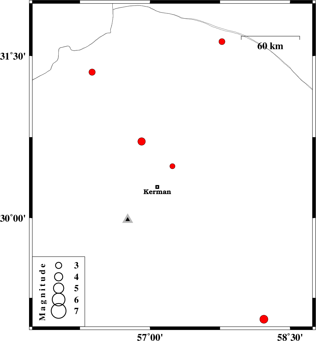 | 2013/12/12 | 11:41:05.3 | 15:11:05.3 | 30.71 | 56.91 | 17 | ML3.7 | Kerman Province, 35 km South-East of Zarand |