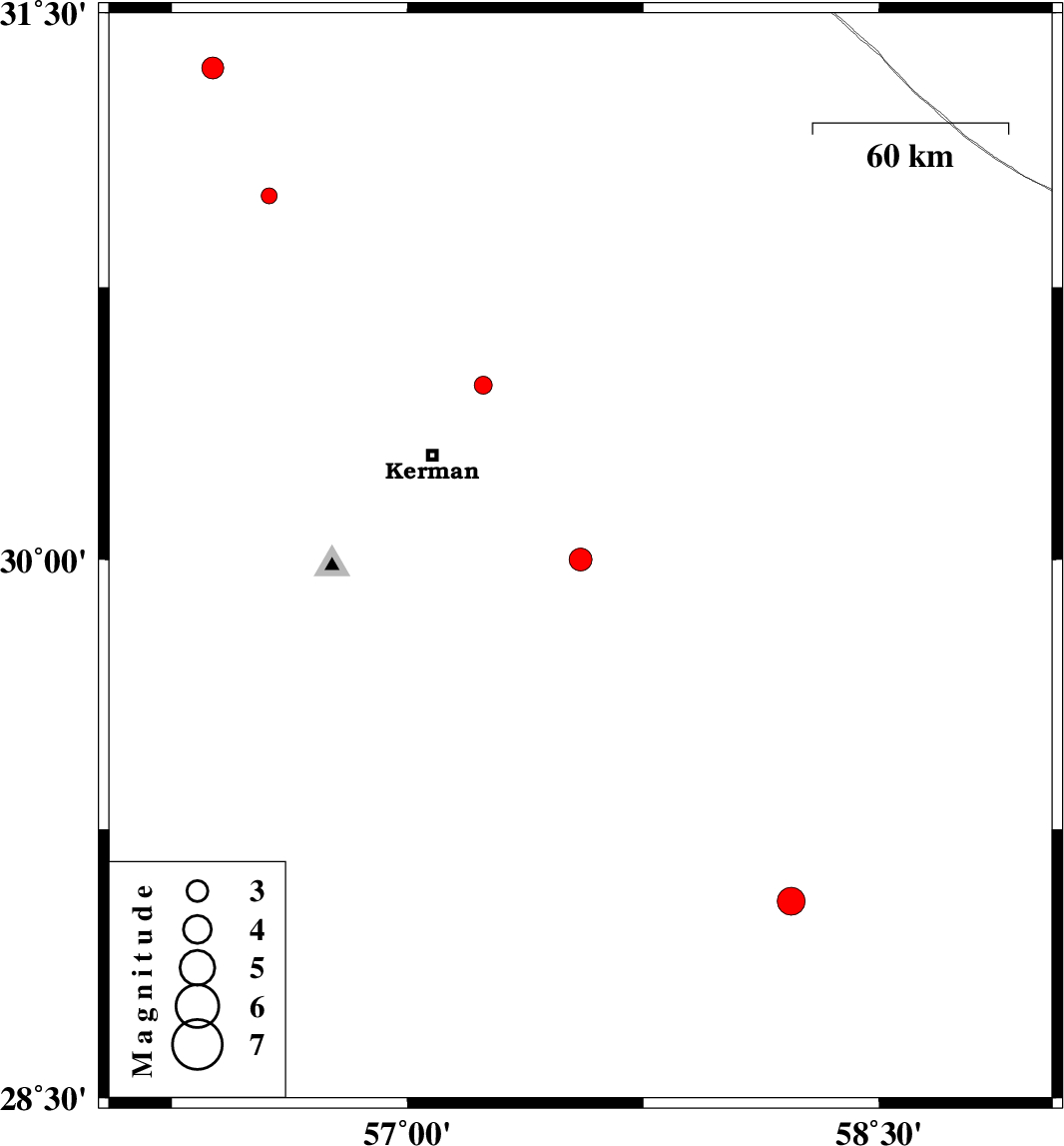 | 2013/12/23 | 06:11:07.9 | 09:41:07.9 | 30 | 57.55 | 14 | ML3.2 | Kerman Province, 56 km South-East of Kerman | ||
