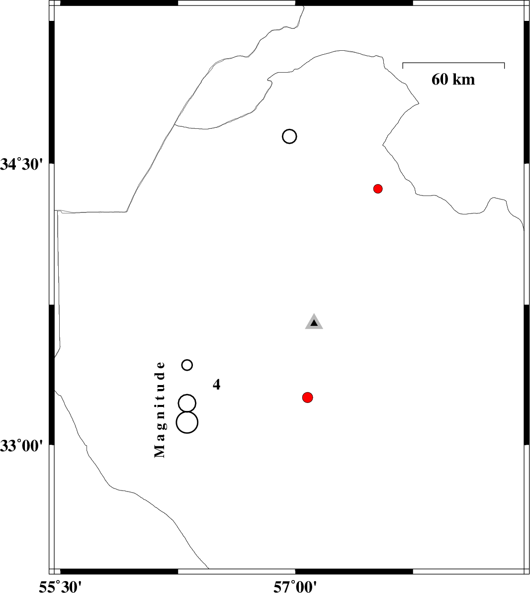 | 2014/01/08 | 18:40:12.3 | 22:10:12.3 | 33.83 | 56.96 | 12 | ML2.6 | Yazd Province, 25 km North of Tabas | ||
