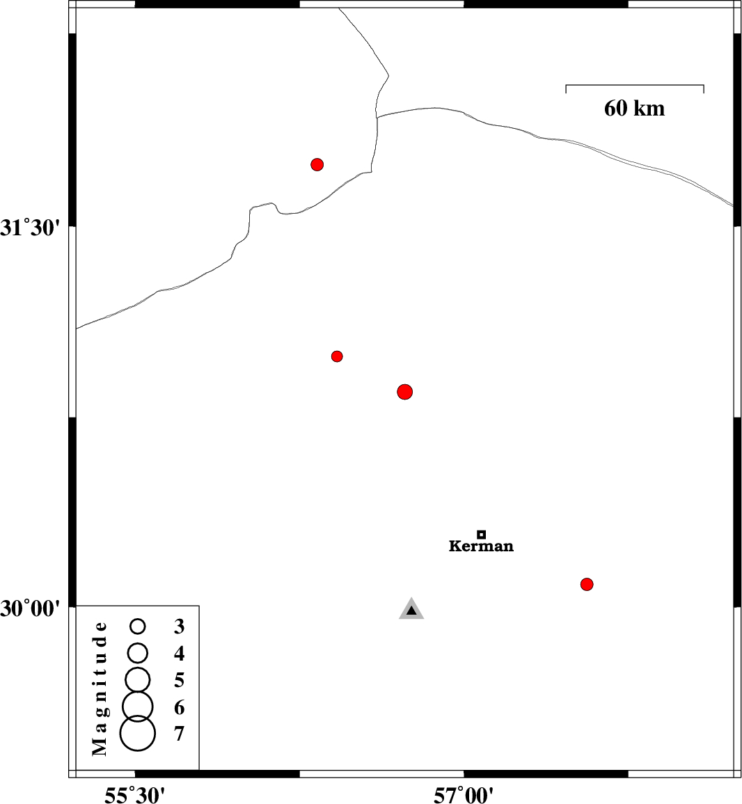 | 2014/01/31 | 23:57:53.7 | 03:27:53.7 | 30.09 | 57.56 | 14 | ML2.5 | Kerman Province, 51 km South-East of Kerman | ||