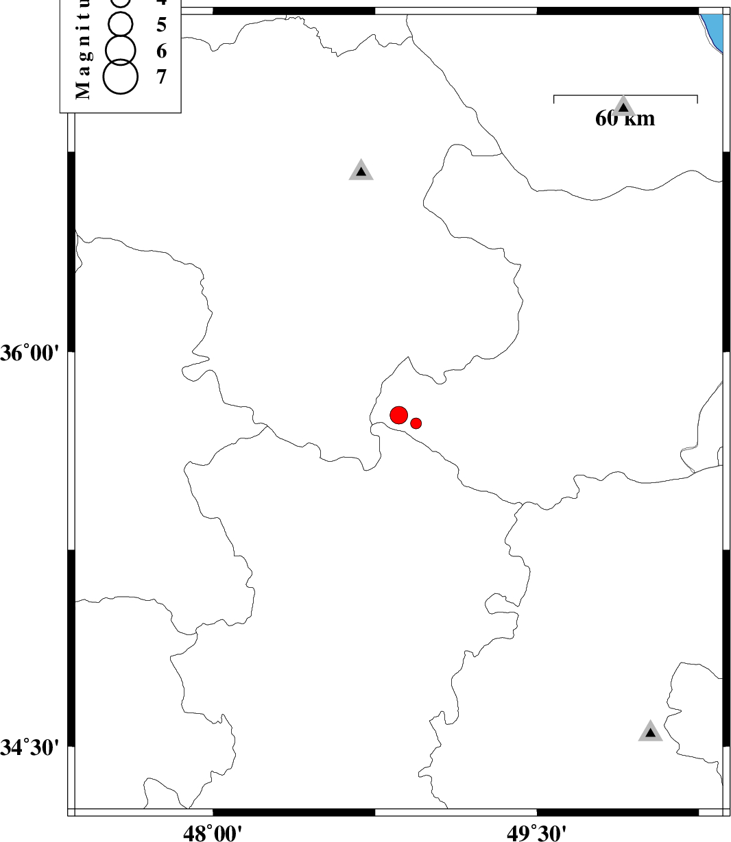 | 2014/02/04 | 01:42:08.5 | 05:12:08.5 | 35.76 | 48.86 | 39 | ML3.6 | Ghazvin Province, 45 km North-West of Razan | ||