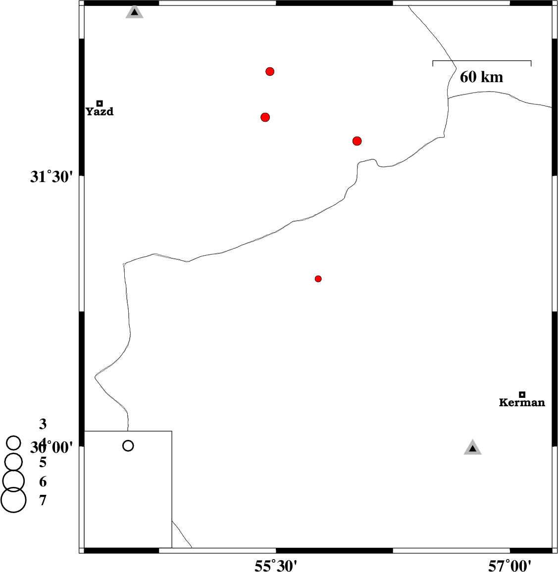 | 2014/02/23 | 13:42:09.7 | 17:12:09.7 | 31.82 | 55.43 | 15 | ML2.5 | Yazd Province, 24 km North of Bafq | ||