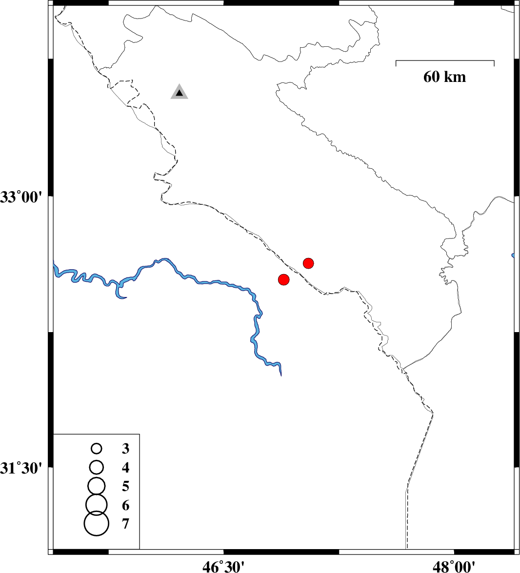 | 2014/03/03 | 22:12:49.2 | 01:42:49.2 | 32.54 | 46.89 | 14 | ML3.2 | Iraq, 39 km South-West of Dehloran | ||