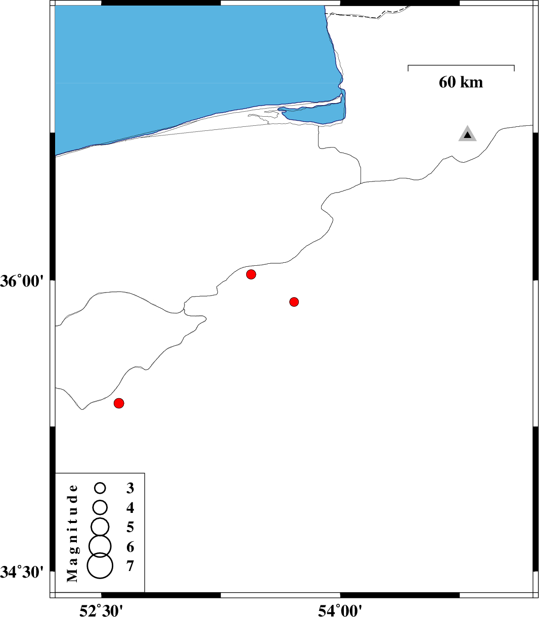 | 2014/03/02 | 00:57:47.4 | 04:27:47.4 | 34.85 | 52.52 | 14 | ML3.9 | Semnan Province, 45 km South-East of Garmsar |