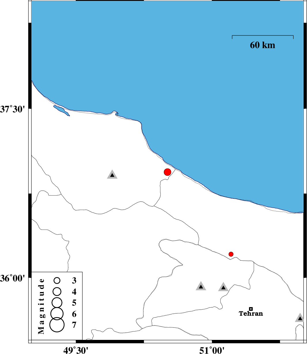 | 2014/03/20 | 11:13:22.5 | 14:43:22.5 | 36.94 | 50.51 | 31 | ML3.5 | Gilan Province, 13 km West of Ramsar | ||