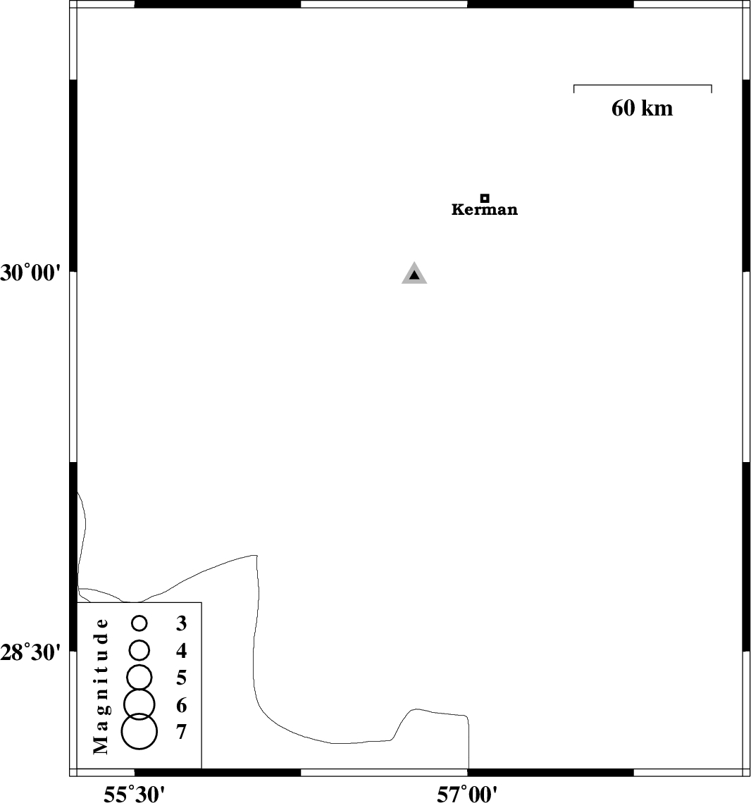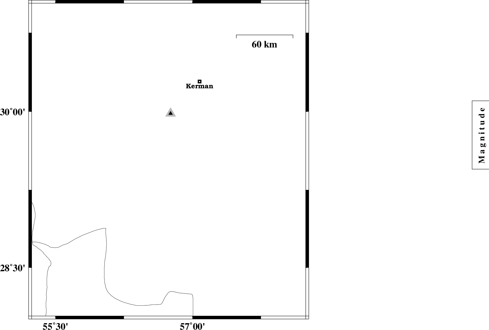 | 2014/03/30 | 06:45:38.8 | 11:15:38.8 | 29.53 | 56.74 | 12 | ML2.5 | Kerman Province, 35 km North-East of Baft |