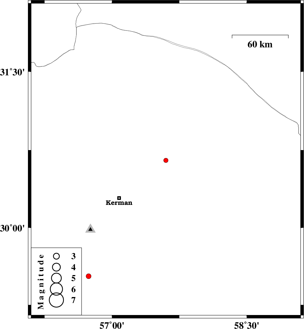 | 2014/03/30 | 06:45:38.8 | 11:15:38.8 | 29.53 | 56.74 | 12 | ML2.5 | Kerman Province, 35 km North-East of Baft |