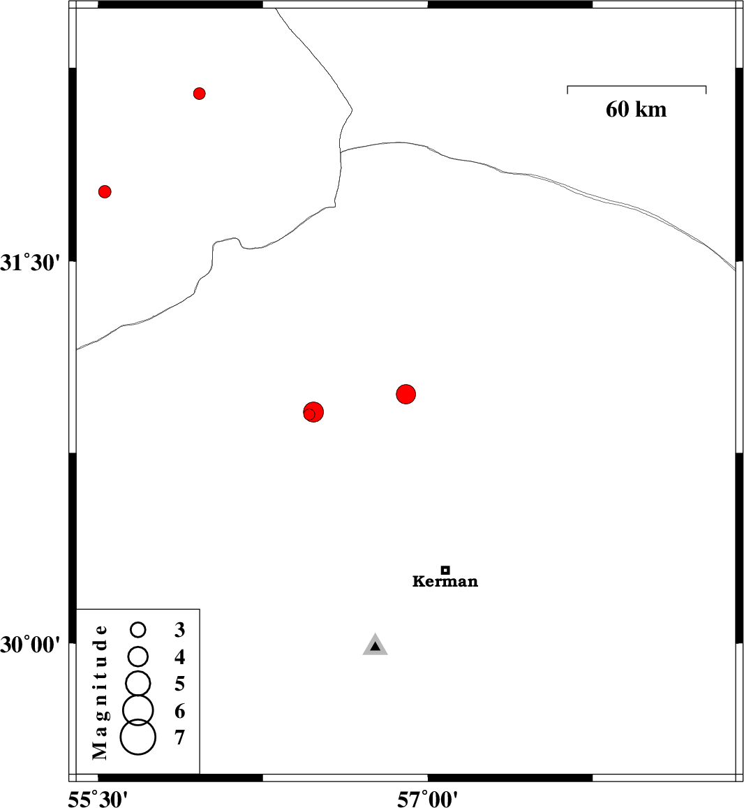 | 2014/04/11 | 23:36:13.3 | 04:06:13.3 | 30.98 | 56.9 | 14 | ML4 | Kerman Province, 33 km South of Ravar | ||