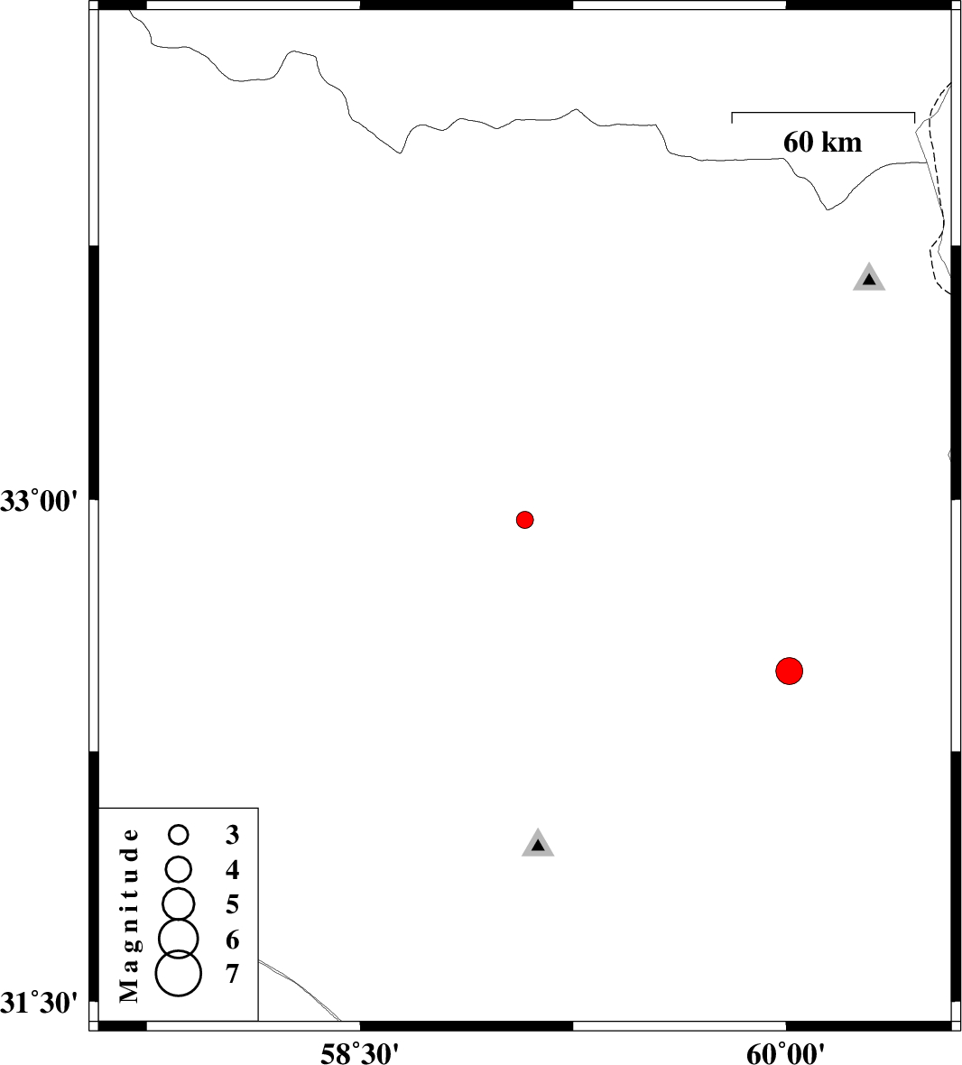 | 2014/04/07 | 00:12:22.6 | 04:42:22.6 | 32.49 | 60.01 | 14 | ML4.3 | Khorasan(south) Province, 26 km South-East of Sarbisheh |