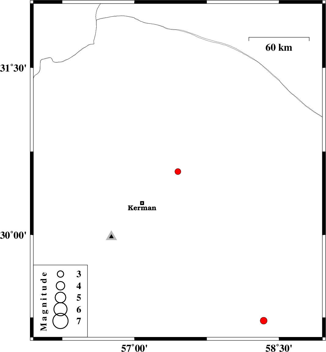 | 2014/04/23 | 11:15:41.9 | 15:45:41.9 | 30.57 | 57.45 | 14 | ML2.8 | Kerman Province, 47 km North-East of Kerman |