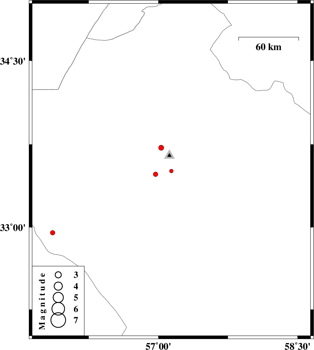 | 2014/05/06 | 00:53:55.9 | 05:23:55.9 | 33.51 | 57.14 | 14 | ML1.9 | Yazd Province, 22 km East of Tabas | ||