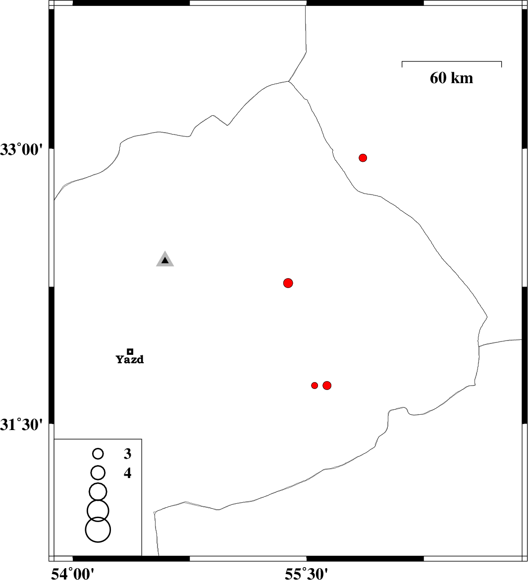 | 2014/05/05 | 12:59:31.5 | 17:29:31.5 | 31.71 | 55.55 | 38 | ML1.8 | Yazd Province, 19 km North-East of Bafq |