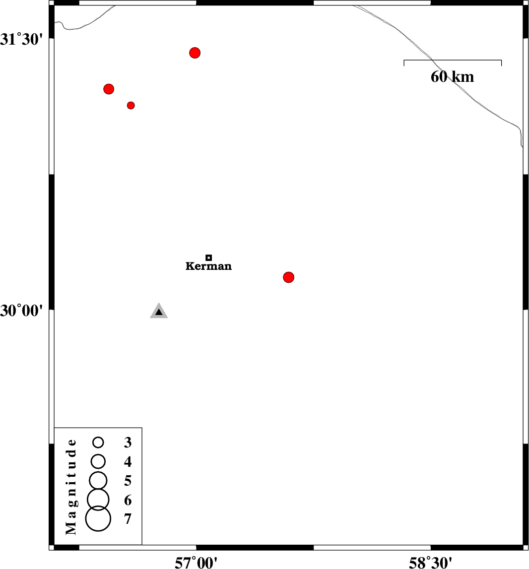 | 2014/05/14 | 17:52:37.9 | 22:22:37.9 | 31.22 | 56.44 | 14 | ML3 | Kerman Province, 36 km West of Ravar |