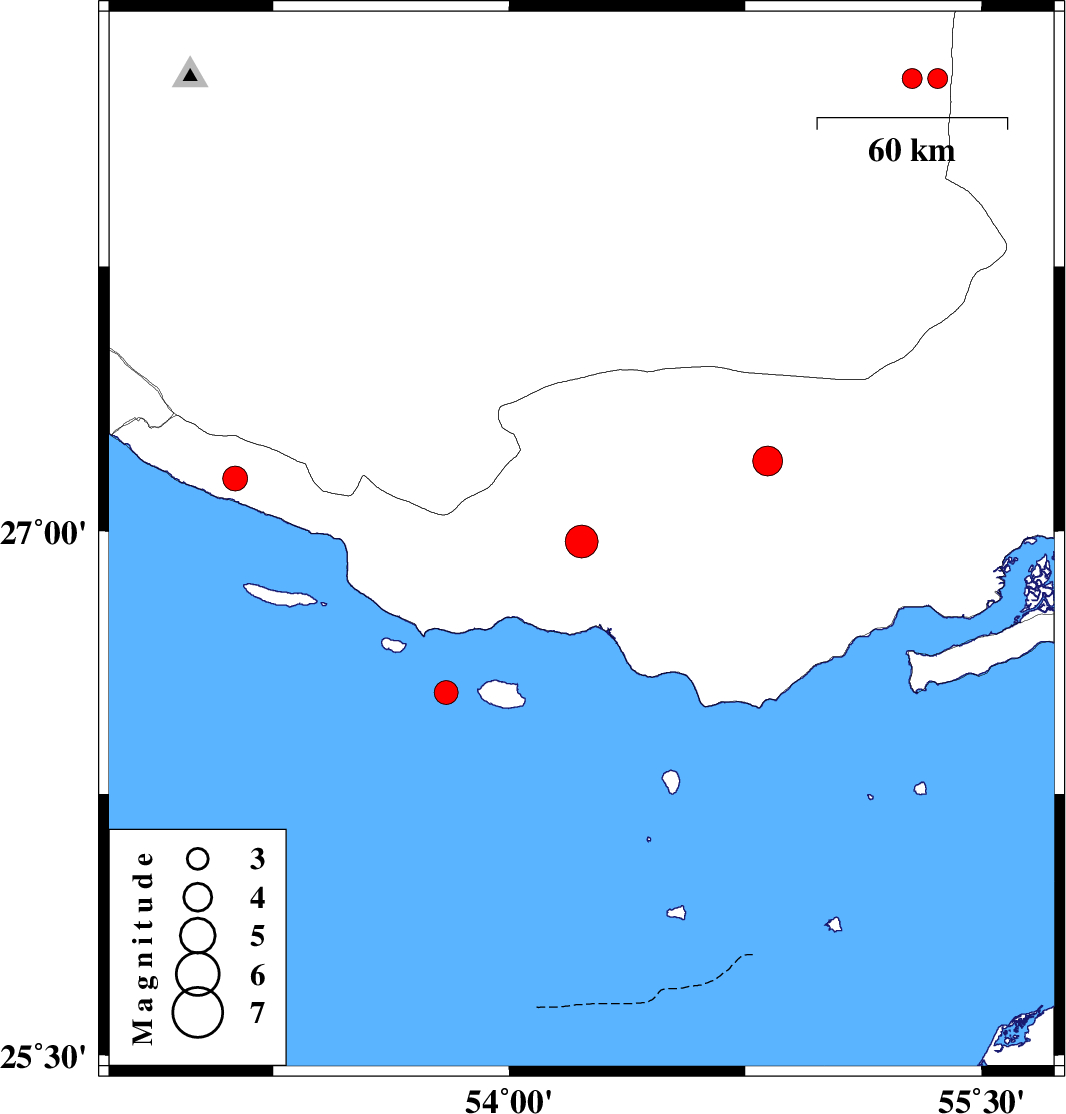 | 2014/05/07 | 15:04:21.0 | 19:34:21.0 | 26.54 | 53.8 | 14 | ML3.4 | Persian Gulf |