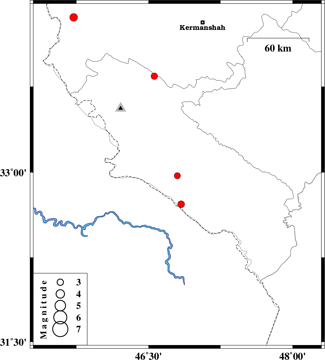 | 2014/06/03 | 05:30:32.8 | 10:00:32.8 | 32.72 | 46.84 | 14 | ML3.2 | Ilam Province, 39 km West of Dehloran |